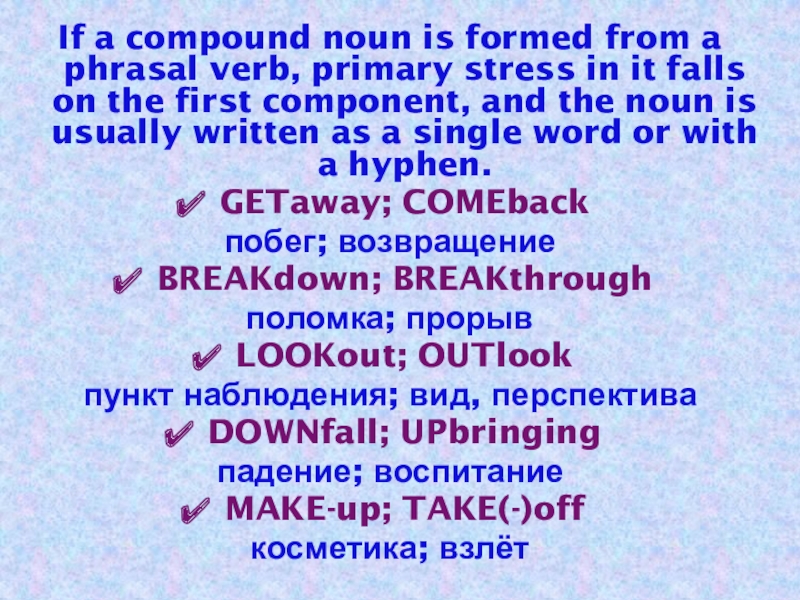 Слайд 27If a compound noun is formed from a phrasal verb, primary
