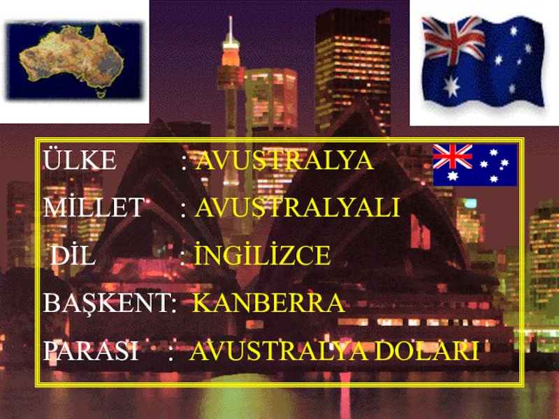 ÜLKE : AVUSTRALYAMİLLET : AVUSTRALYALI DİL : İNGİLİZCEBAŞKENT: KANBERRAPARASI : AVUSTRALYA DOLARI