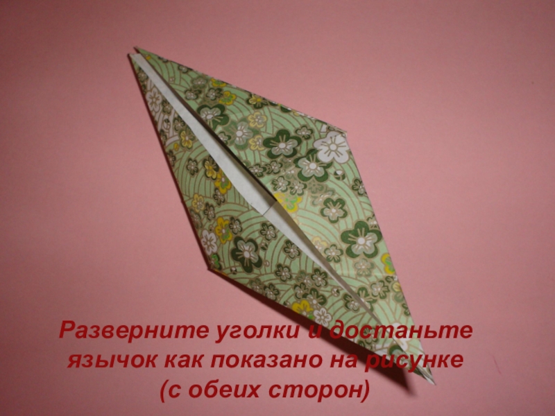Слайд 10Разверните уголки и достаньте язычок как показано на рисунке (с обеих