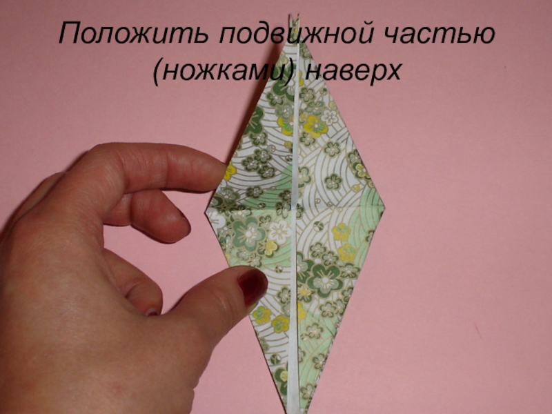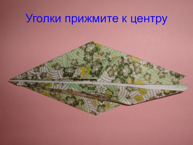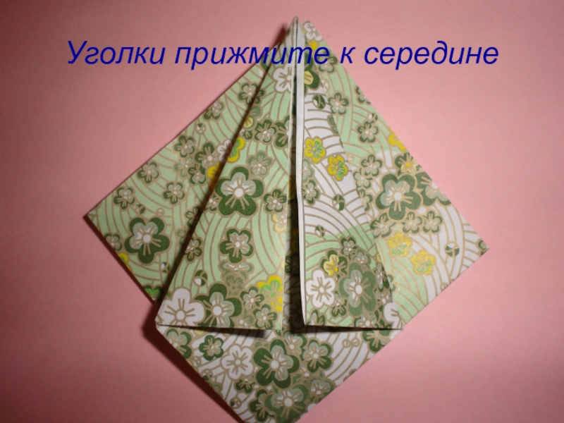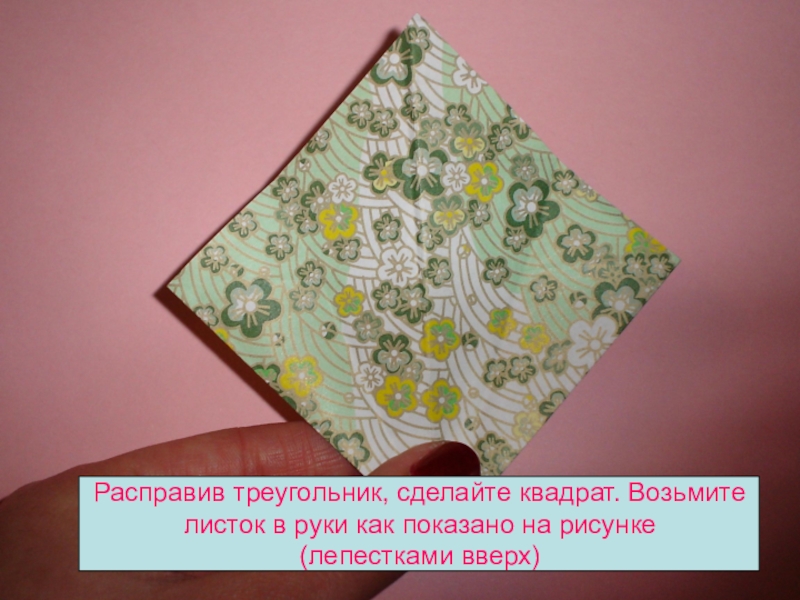 Расправив треугольник, сделайте квадрат. Возьмите листок в руки как показано на рисунке  (лепестками вверх)