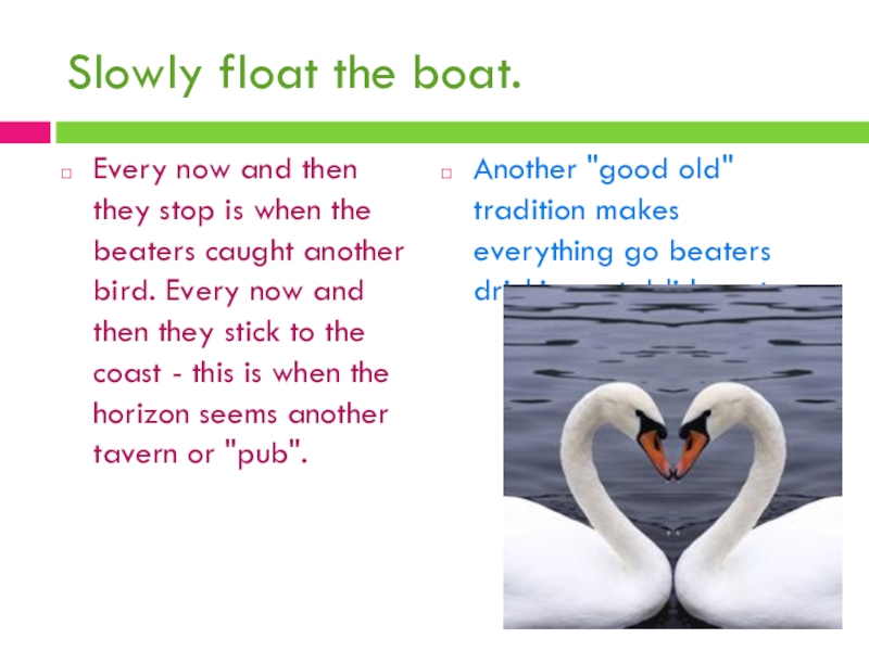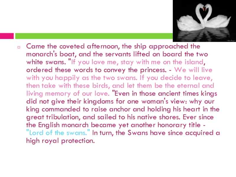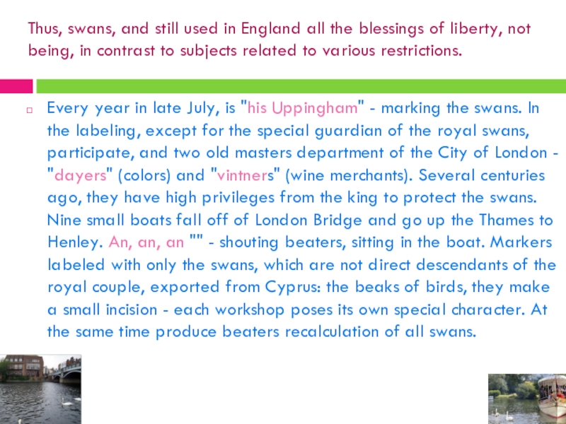 Every year in late July, is "his Uppingham" - marking the swans. In the labeling, except for the special guardian of the royal swans, participate, and two old masters department of the City of London - "dayers" (colors) and "vintners" (wine merchants). Several centuries ago, they have high privileges from the king to protect the swans. Nine small boats fall off of London Bridge and go up the Thames to Henley. An, an, an "" - shouting beaters, sitting in the boat. Markers labeled with only the swans, which are not direct descendants of the royal couple, exported from Cyprus: the beaks of birds, they make a small incision - each workshop poses its own special character. At the same time produce beaters recalculation of all swans.