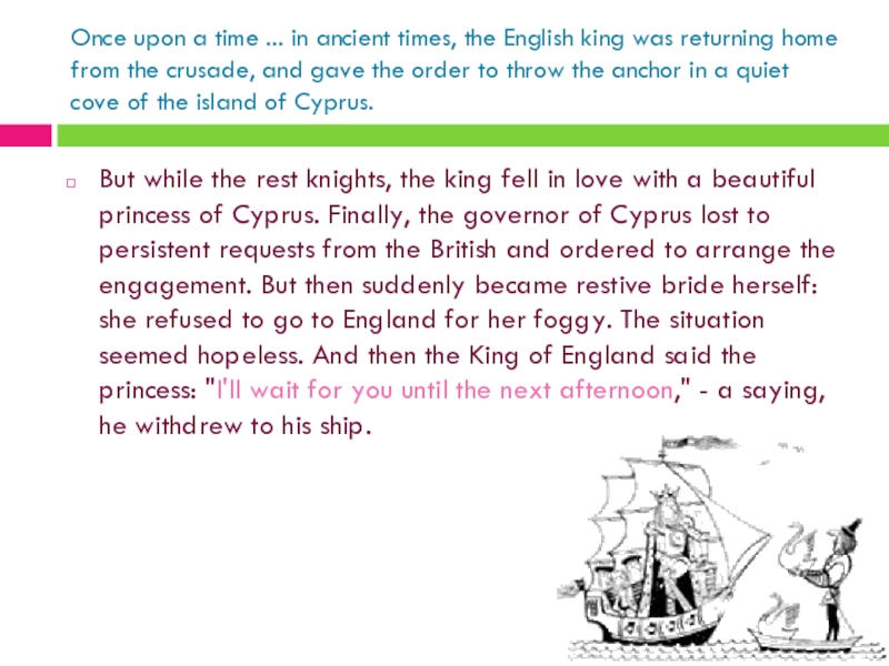 But while the rest knights, the king fell in love with a beautiful princess of Cyprus. Finally, the governor of Cyprus lost to persistent requests from the British and ordered to arrange the engagement. But then suddenly became restive bride herself: she refused to go to England for her foggy. The situation seemed hopeless. And then the King of England said the princess: "I'll wait for you until the next afternoon," - a saying, he withdrew to his ship.