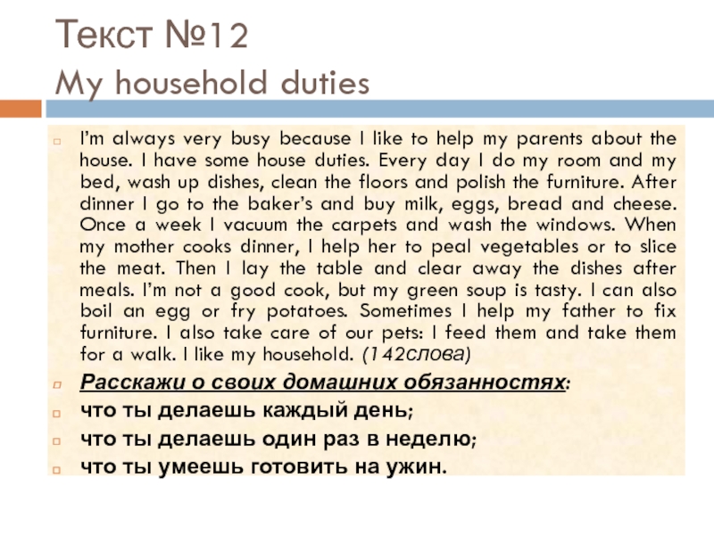 help my parents about the house. I have some house duties. Every day I do my room and my bed, wash up dishes, clean the floors and polish the furniture. After dinner I go to the baker’s and buy milk, eggs, bread and cheese. Once a week I vacuum the carpets and wash the windows. When my mother cooks dinner, I help her to peal vegetables or to slice the meat. Then I lay the table and clear away the dishes after meals. I’m not a good cook, but my green soup is tasty. I can also boil an egg or fry potatoes. Sometimes I help my father to fix furniture. I also take care of our pets: I feed them and take them for a walk. I like my household. (142слова)