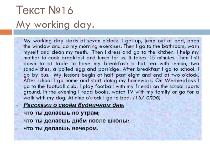 get up, jump out of bed, open the window and do my morning exercises. Then I go to the bathroom, wash myself and clean my teeth. Then I dress and go to the kitchen. I help my mother to cook breakfast and lunch for us. It takes 15 minutes. Then I sit down to at table to have my breakfast: a hot tea with lemon, two sandwiches, a boiled egg and porridge. After breakfast I go to school. I go by bus. My lessons begin at half past eight and end at two o’clock. After school I go home and start doing my homework. On Wednesdays I go to the football club. I play football with my friends on the school sports ground. In the evening I read books, watch TV with my family or go for a walk with my dog. At nine o’clock I go to bed. (157 слов)