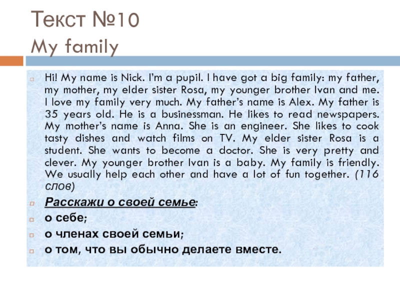 have got a big family: my father, my mother, my elder sister Rosa, my younger brother Ivan and me. I love my family very much. My father’s name is Alex. My father is 35 years old. He is a businessman. He likes to read newspapers. My mother’s name is Anna. She is an engineer. She likes to cook tasty dishes and watch films on TV. My elder sister Rosa is a student. She wants to become a doctor. She is very pretty and clever. My younger brother Ivan is a baby. My family is friendly. We usually help each other and have a lot of fun together. (116 слов)