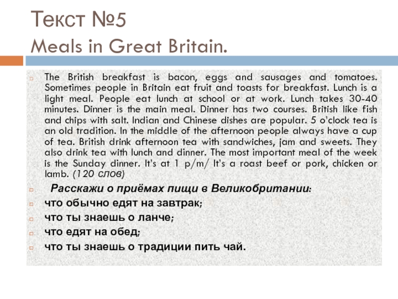 sausages and tomatoes. Sometimes people in Britain eat fruit and toasts for breakfast. Lunch is a light meal. People eat lunch at school or at work. Lunch takes 30-40 minutes. Dinner is the main meal. Dinner has two courses. British like fish and chips with salt. Indian and Chinese dishes are popular. 5 o’clock tea is an old tradition. In the middle of the afternoon people always have a cup of tea. British drink afternoon tea with sandwiches, jam and sweets. They also drink tea with lunch and dinner. The most important meal of the week is the Sunday dinner. It’s at 1 p/m/ It’s a roast beef or pork, chicken or lamb. (120 слов)