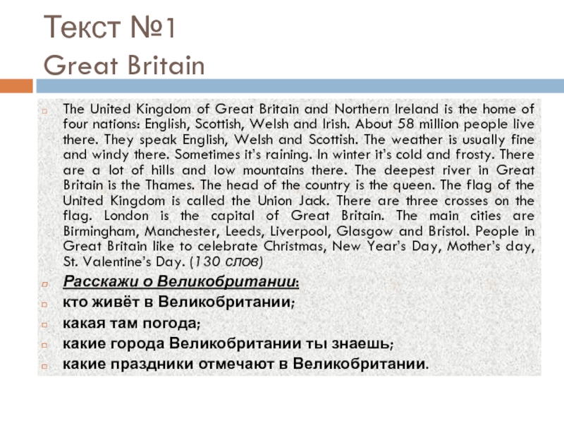 is the home of four nations: English, Scottish, Welsh and Irish. About 58 million people live there. They speak English, Welsh and Scottish. The weather is usually fine and windy there. Sometimes it’s raining. In winter it’s cold and frosty. There are a lot of hills and low mountains there. The deepest river in Great Britain is the Thames. The head of the country is the queen. The flag of the United Kingdom is called the Union Jack. There are three crosses on the flag. London is the capital of Great Britain. The main cities are Birmingham, Manchester, Leeds, Liverpool, Glasgow and Bristol. People in Great Britain like to celebrate Christmas, New Year’s Day, Mother’s day, St. Valentine’s Day. (130 слов)
