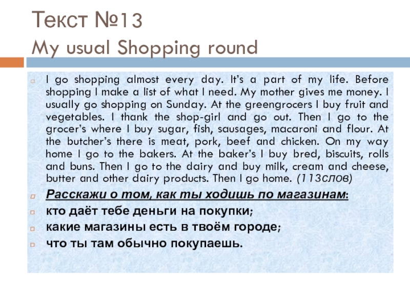 a part of my life. Before shopping I make a list of what I need. My mother gives me money. I usually go shopping on Sunday. At the greengrocers I buy fruit and vegetables. I thank the shop-girl and go out. Then I go to the grocer’s where I buy sugar, fish, sausages, macaroni and flour. At the butcher’s there is meat, pork, beef and chicken. On my way home I go to the bakers. At the baker’s I buy bred, biscuits, rolls and buns. Then I go to the dairy and buy milk, cream and cheese, butter and other dairy products. Then I go home. (113слов)