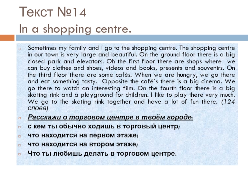 the shopping centre. The shopping centre in our town is very large and beautiful. On the ground floor there is a big closed park and elevators. Oh the first floor there are shops where we can buy clothes and shoes, videos and books, presents and souvenirs. On the third floor there are some cafés. When we are hungry, we go there and eat something tasty. Opposite the café`s there is a big cinema. We go there to watch an interesting film. On the fourth floor there is a big skating rink and a playground for children. I like to play there very much. We go to the skating rink together and have a lot of fun there. (124 слова)