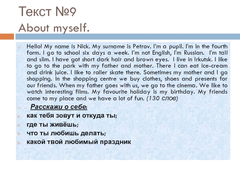 I’m a pupil. I’m in the fourth form. I go to school six days a week. I’m not English, I’m Russian. I’m tall and slim. I have got short dark hair and brown eyes. I live in Irkutsk. I like to go to the park with my father and mother. There I can eat ice-cream and drink juice. I like to roller skate there. Sometimes my mother and I go shopping. In the shopping centre we buy clothes, shoes and presents for our friends. When my father goes with us, we go to the cinema. We like to watch interesting films. My favourite holiday is my birthday. My friends come to my place and we have a lot of fun. (130 слов)