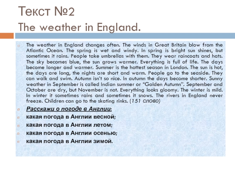 winds in Great Britain blow from the Atlantic Ocean. The spring is wet and windy. In spring is bright sun shines, but sometimes it rains. People take umbrellas with them. They wear raincoats and hats. The sky becomes blue, the sun grows warmer. Everything is full of life. The days become longer and warmer. Summer is the hottest season in London. The sun is hot, the days are long, the nights are short and warm. People go to the seaside. They can walk and swim. Autumn isn’t so nice. In autumn the days become shorter. Sunny weather in September is called Indian summer or “Golden Autumn”. September and October are dry, but November is not. Everything looks gloomy. The winter is mild. In winter it sometimes rains and sometimes it snows. The rivers in England never freeze. Children can go to the skating rinks. (151 слово)