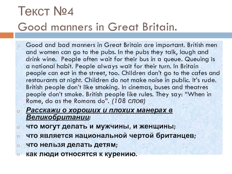 Britain are important. British men and women can go to the pubs. In the pubs they talk, laugh and drink wine. People often wait for their bus in a queue. Queuing is a national habit. People always wait for their turn. In Britain people can eat in the street, too. Children don’t go to the cafes and restaurants at night. Children do not make noise in public. It’s rude. British people don’t like smoking. In cinemas, buses and theatres people don’t smoke. British people like rules. They say: “When in Rome, do as the Romans do”. (108 слов)