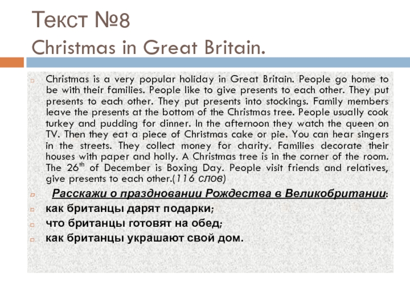 Great Britain. People go home to be with their families. People like to give presents to each other. They put presents to each other. They put presents into stockings. Family members leave the presents at the bottom of the Christmas tree. People usually cook turkey and pudding for dinner. In the afternoon they watch the queen on TV. Then they eat a piece of Christmas cake or pie. You can hear singers in the streets. They collect money for charity. Families decorate their houses with paper and holly. A Christmas tree is in the corner of the room. The 26th of December is Boxing Day. People visit friends and relatives, give presents to each other.(116 слов)