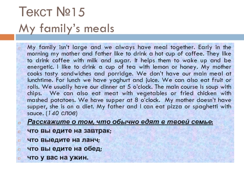 meal together. Early in the morning my mother and father like to drink a hot cup of coffee. They like to drink coffee with milk and sugar. It helps them to wake up and be energetic. I like to drink a cup of tea with lemon or honey. My mother cooks tasty sandwiches and porridge. We don’t have our main meal at lunchtime. For lunch we have yoghurt and juice. We can also eat fruit or rolls. We usually have our dinner at 5 o’clock. The main course is soup with chips. We can also eat meat with vegetables or fried chicken with mashed potatoes. We have supper at 8 o’clock. My mother doesn’t have supper, she is on a diet. My father and I can eat pizza or spaghetti with sauce. (140 слов)