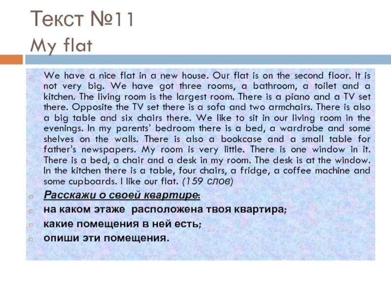 Our flat is on the second floor. It is not very big. We have got three rooms, a bathroom, a toilet and a kitchen. The living room is the largest room. There is a piano and a TV set there. Opposite the TV set there is a sofa and two armchairs. There is also a big table and six chairs there. We like to sit in our living room in the evenings. In my parents’ bedroom there is a bed, a wardrobe and some shelves on the walls. There is also a bookcase and a small table for father’s newspapers. My room is very little. There is one window in it. There is a bed, a chair and a desk in my room. The desk is at the window. In the kitchen there is a table, four chairs, a fridge, a coffee machine and some cupboards. I like our flat. (159 слов)