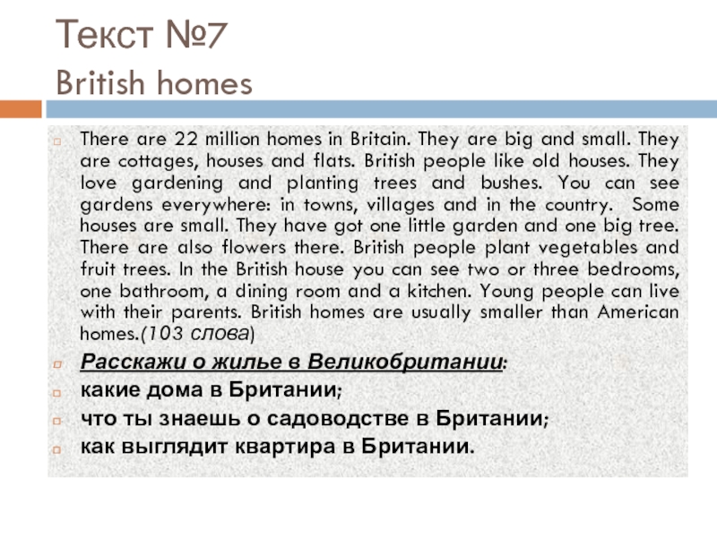 big and small. They are cottages, houses and flats. British people like old houses. They love gardening and planting trees and bushes. You can see gardens everywhere: in towns, villages and in the country. Some houses are small. They have got one little garden and one big tree. There are also flowers there. British people plant vegetables and fruit trees. In the British house you can see two or three bedrooms, one bathroom, a dining room and a kitchen. Young people can live with their parents. British homes are usually smaller than American homes.(103 слова)