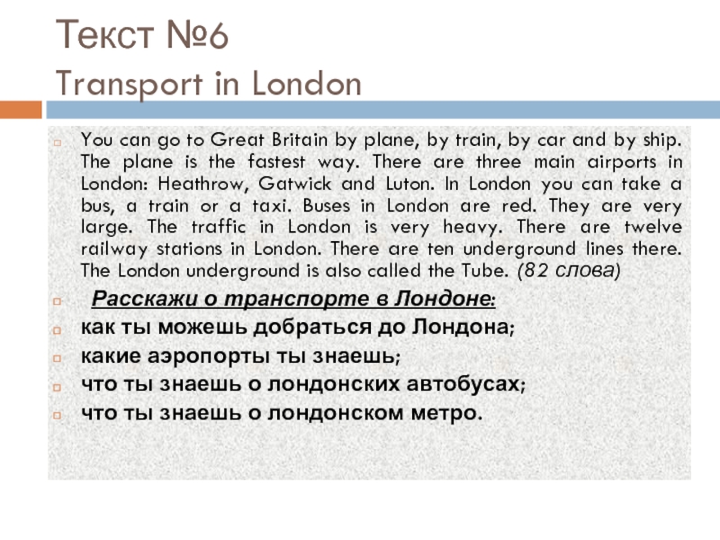 by train, by car and by ship. The plane is the fastest way. There are three main airports in London: Heathrow, Gatwick and Luton. In London you can take a bus, a train or a taxi. Buses in London are red. They are very large. The traffic in London is very heavy. There are twelve railway stations in London. There are ten underground lines there. The London underground is also called the Tube. (82 слова)