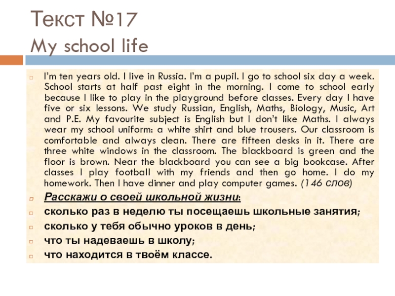 I’m a pupil. I go to school six day a week. School starts at half past eight in the morning. I come to school early because I like to play in the playground before classes. Every day I have five or six lessons. We study Russian, English, Maths, Biology, Music, Art and P.E. My favourite subject is English but I don’t like Maths. I always wear my school uniform: a white shirt and blue trousers. Our classroom is comfortable and always clean. There are fifteen desks in it. There are three white windows in the classroom. The blackboard is green and the floor is brown. Near the blackboard you can see a big bookcase. After classes I play football with my friends and then go home. I do my homework. Then I have dinner and play computer games. (146 слов)