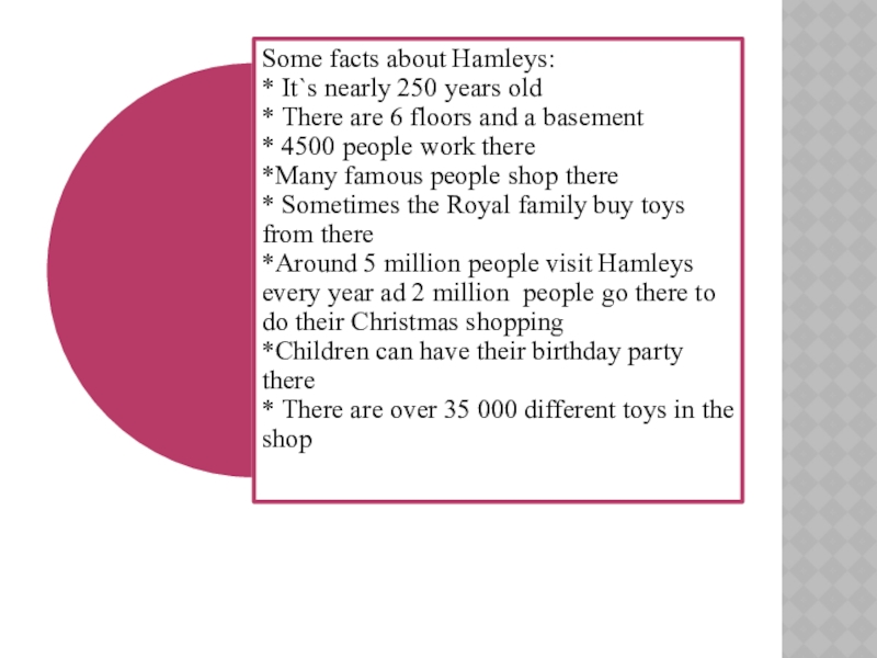 floors in the shop. 3. 4 500 people work there. 4. 22 million people visit it every year. 5. 35 000 different toys there are in the shop.