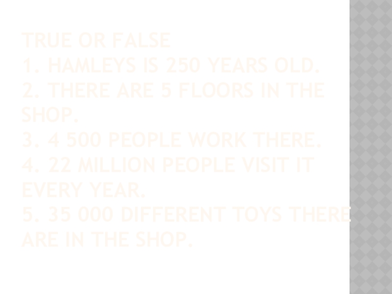 Слайд 6True or false 1. Hamleys is 250 years old. 2. there are 5