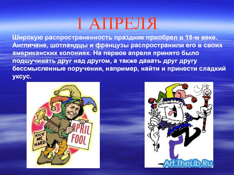 французы распространили его в своих американских колониях. На первое апреля принято было подшучивать друг над другом, а также давать друг другу бессмысленные поручения, например, найти и принести сладкий уксус.