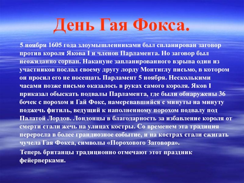 короля Якова I и членов Парламента. Но заговор был неожиданно сорван. Накануне запланированного взрыва один из участников послал своему другу лорду Монтиглу письмо, в котором он просил его не посещать Парламент 5 ноября. Несколькими часами позже письмо оказалось в руках самого короля. Яков I приказал обыскать подвалы Парламента, где были обнаружены 36 бочек с порохом и Гай Фокс, намеревавшийся с минуты на минуту поджечь фитиль, ведущий к наполненному порохом подвалу под Палатой Лордов. Лондонцы в благодарность за избавление короля от смерти стали жечь на улицах костры. Со временем эта традиция переросла в более грандиозное событие, и на кострах стали сжигать чучела Гая Фокса, символы «Порохового Заговора».