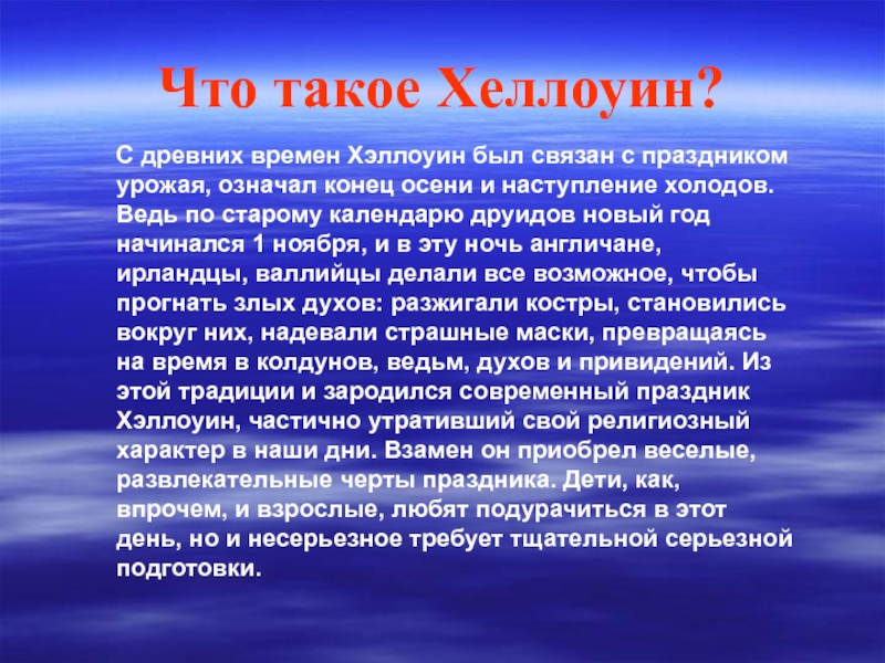 означал конец осени и наступление холодов. Ведь по старому календарю друидов новый год начинался 1 ноября, и в эту ночь англичане, ирландцы, валлийцы делали все возможное, чтобы прогнать злых духов: разжигали костры, становились вокруг них, надевали страшные маски, превращаясь на время в колдунов, ведьм, духов и привидений. Из этой традиции и зародился современный праздник Хэллоуин, частично утративший свой религиозный характер в наши дни. Взамен он приобрел веселые, развлекательные черты праздника. Дети, как, впрочем, и взрослые, любят подурачиться в этот день, но и несерьезное требует тщательной серьезной подготовки.