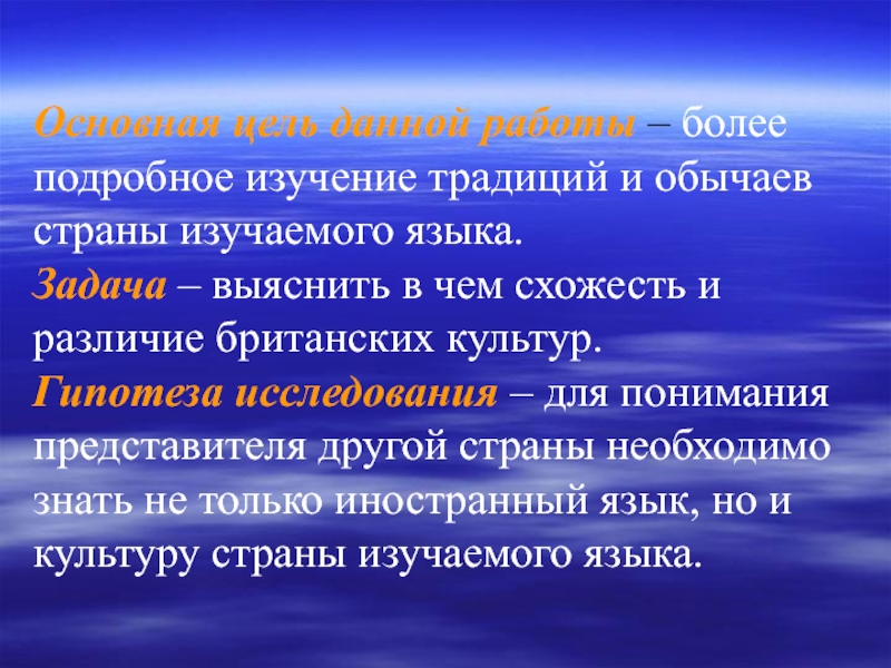 Гипотеза исследования – для понимания представителя другой страны необходимо знать не только иностранный язык, но и культуру страны изучаемого языка.