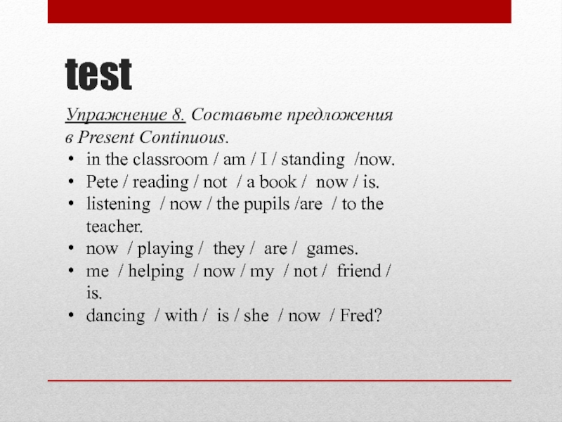 testУпражнение 8. Составьте предложения в Present Continuous.in the classroom / am / I / standing  /now.Pete / reading