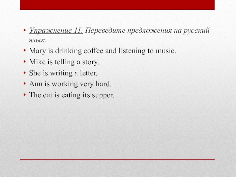 Упражнение 11. Переведите предложения на русский язык.Mary is drinking coffee and listening to music.Mike is telling a story.She
