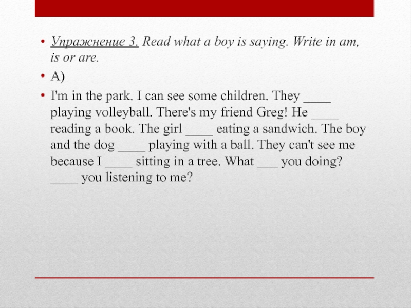 Упражнение 3. Read what a boy is saying. Write in am, is or are.A)I'm in the park. I can