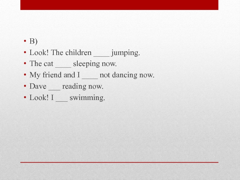 B)Look! The children ____ jumping.The cat ____ sleeping now.My friend and I ____ not dancing now.Dave ___