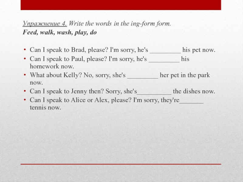 Упражнение 4. Write the words in the ing-form form.Feed, walk, wash, play, doCan I speak to Brad, please? I'm