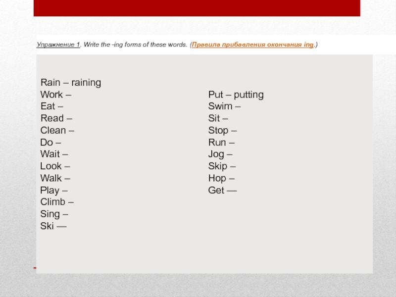 Слайд 2Упражнение 1. Write the -ing forms of these words. (Правила прибавления окончания ing.)