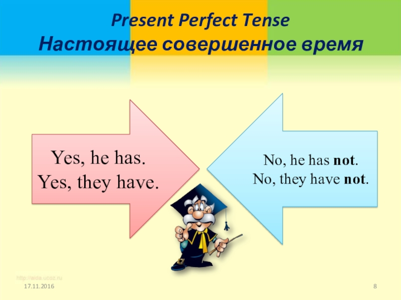 Present Perfect Tense Настоящее совершенное время Yes, he has.Yes, they have.No, he has not.No, they have not.