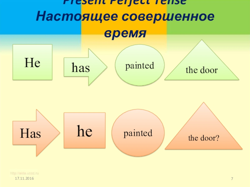 Present Perfect Tense Настоящее совершенное время He haspaintedthe doorHas hepaintedthe door?