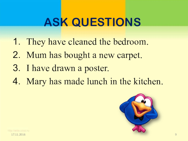 ASK QUESTIONSThey have cleaned the bedroom.Mum has bought a new carpet.I have drawn a poster. Mary has