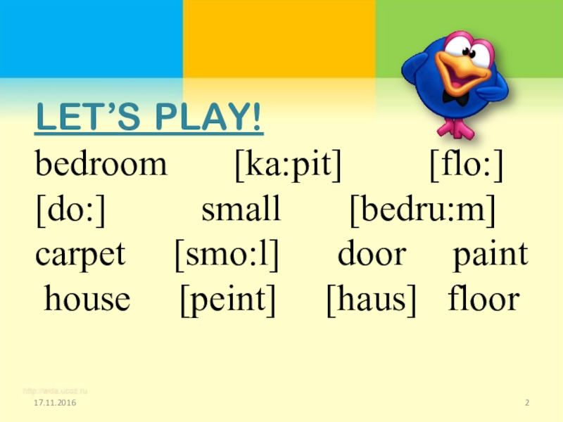 Слайд 2LET’S PLAY! bedroom [ka:pit] [flo:] [do:]