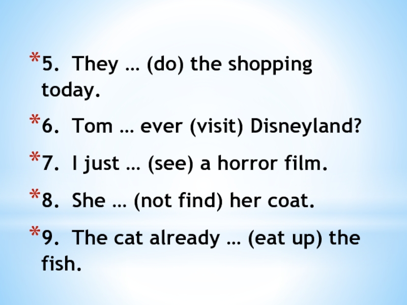 5.	They … (do) the shopping today. 6.	Tom … ever (visit) Disneyland? 7.	I just … (see) a horror