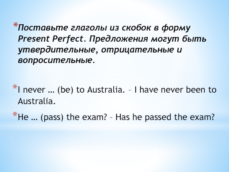 Слайд 4Поставьте глаголы из скобок в форму Present Perfect. Предложения могут быть