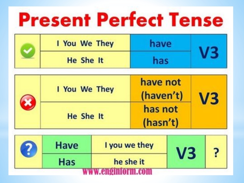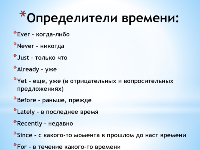 Определители времени:Ever – когда-либоNever – никогдаJust – только чтоAlready – ужеYet – еще, уже (в отрицательных и вопросительных предложениях)Before – раньше, преждеLately – в последнее времяRecently – недавноSince – с какого-то момента в прошлом до наст