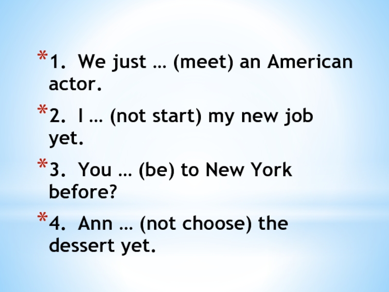 1.	We just … (meet) an American actor. 2.	I … (not start) my new job yet. 3.	You …