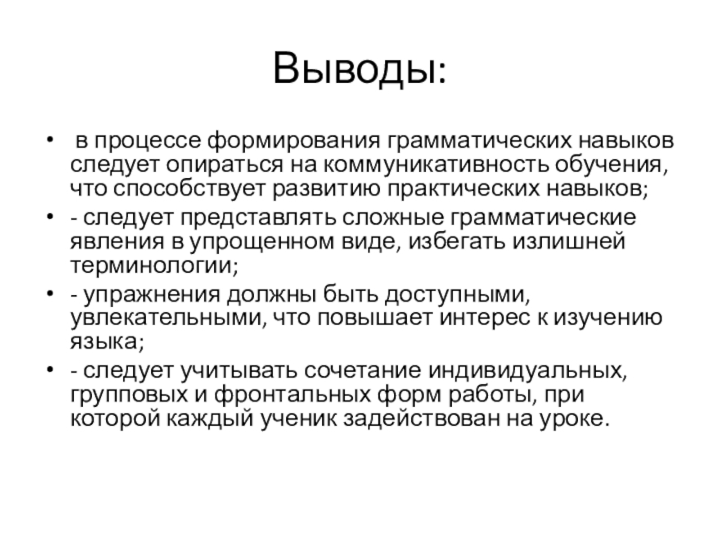Выводы: в процессе формирования грамматических навыков следует опираться на коммуникативность обучения, что способствует развитию практических навыков;- следует представлять