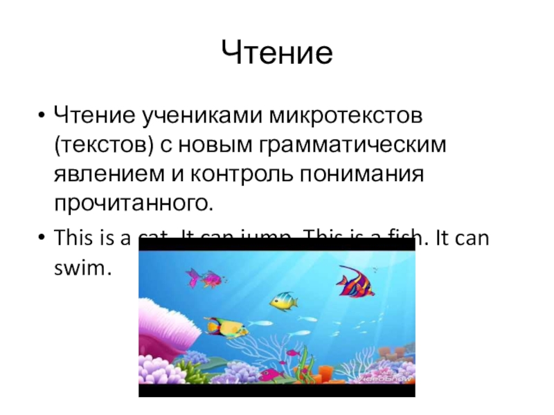 ЧтениеЧтение учениками микротекстов (текстов) с новым грамматическим явлением и контроль понимания прочитанного.This is a cat. It can