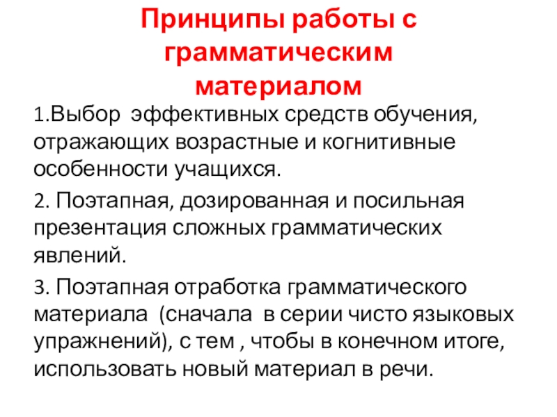 Принципы работы с грамматическим  материалом1.Выбор эффективных средств обучения, отражающих возрастные и когнитивные особенности учащихся.2. Поэтапная, дозированная
