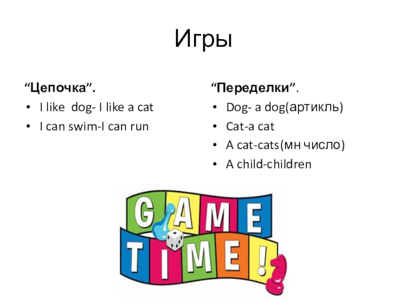 Игры“Цепочка”.I like dog- I like a catI can swim-I can run“Переделки”.Dog- a dog(артикль)Cat-a catA cat-cats(мн число)A child-children