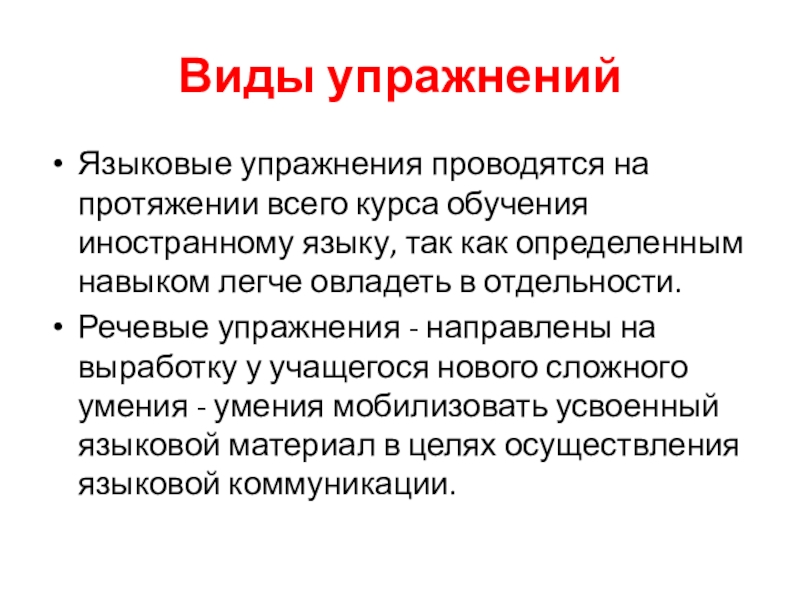 Виды упражнений Языковые упражнения проводятся на протяжении всего курса обучения иностранному языку, так как определенным навыком легче