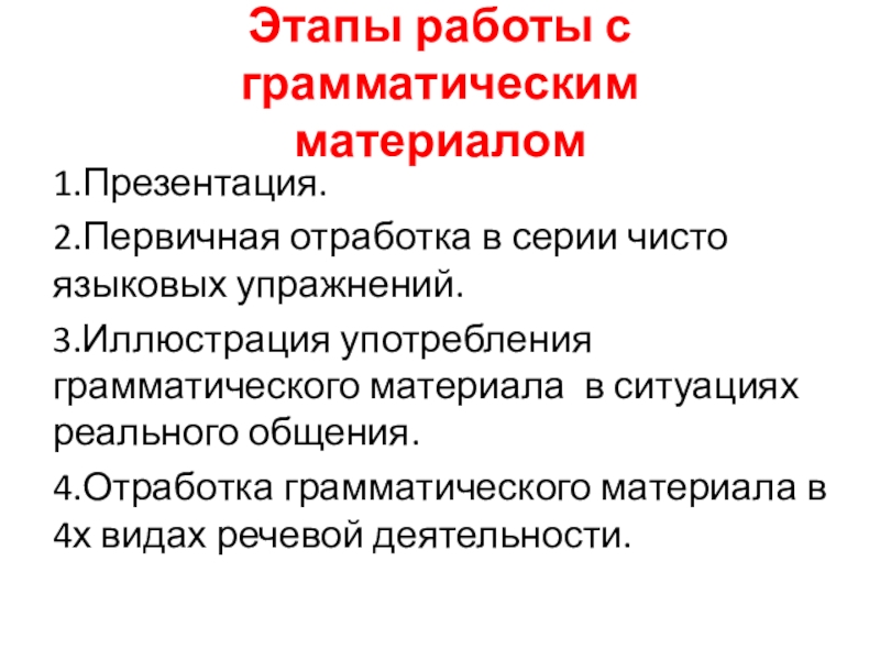 Этапы работы с грамматическим  материалом1.Презентация.2.Первичная отработка в серии чисто языковых упражнений.3.Иллюстрация употребления грамматического материала в ситуациях