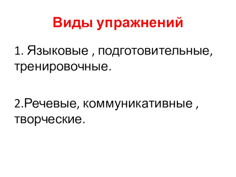 Виды упражнений 1. Языковые , подготовительные, тренировочные.2.Речевые, коммуникативные , творческие.