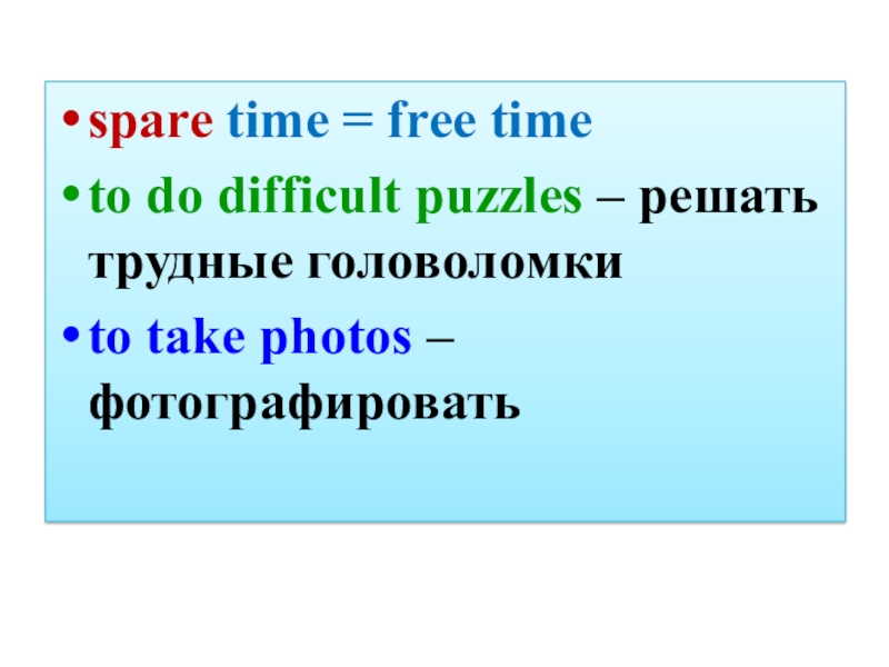 spare time = free timeto do difficult puzzles – решать трудные головоломкиto take photos – фотографировать